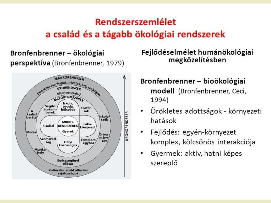 Urie Bronfenbrenner amerikai pszichológus ökológiai rendszerelmélete – amelyet a korábbi gyermekfejlődési elméletek alternatívájaként alkotott meg az 1970-es évek elején – a gyermek fejlődését a környezet több szintje által befolyásolt kapcsolatok összetett rendszerének tekinti, a közvetlen családi és iskolai környezettől a tágabb kulturális értékekig, törvényekig és szokásokig. Ez azt jelenti, hogy a gyermek fejlődésének tanulmányozásához nemcsak a gyermeket és közvetlen környezetét kell vizsgálnunk, hanem a tágabb környezet kölcsönhatásait is.